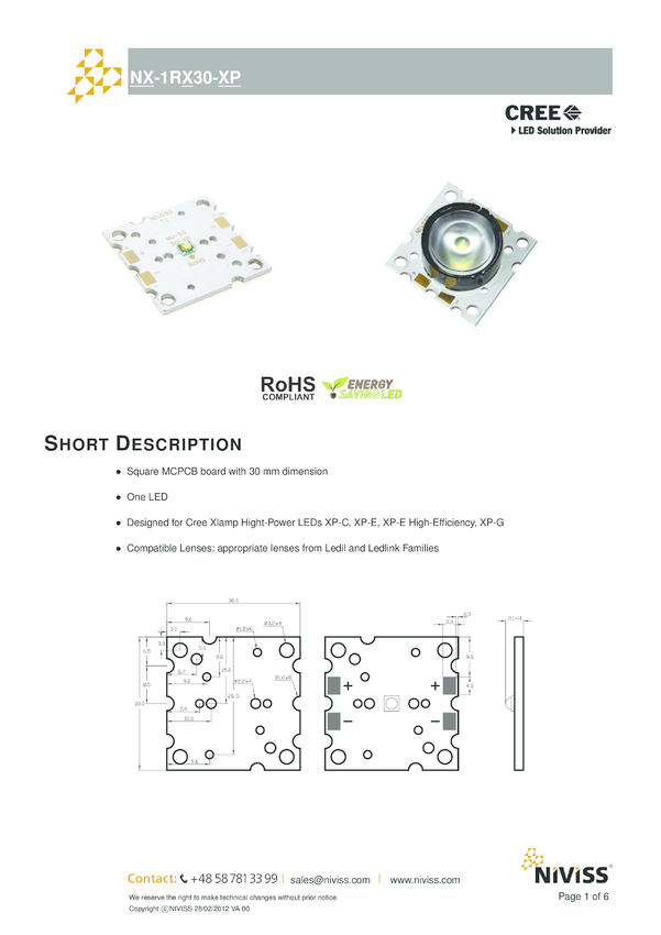 Moduł 1x LED Cree , jasność R3 - 122lm /350 mA , - barwa 1A (ok.6500-7100K), biała soldermaska, kwadrat 30 x 30 mm, grubość płytki 1.6mm