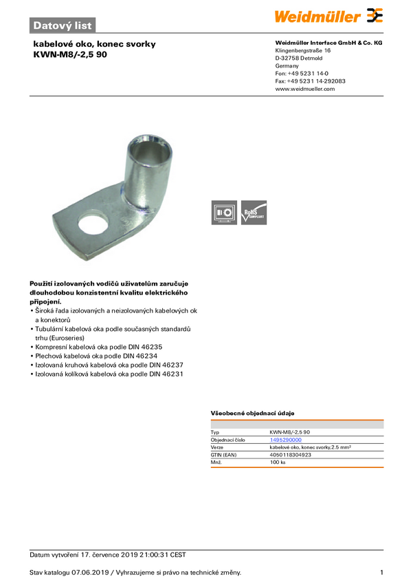Weidmüller 1495330000 Końcówka kablowa, rurkowa KWN-M8/-4 90, M8, 4 mm², 90 °, 100 szt.