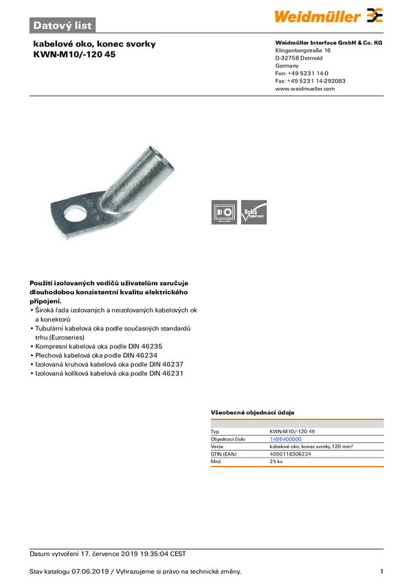 Weidmüller 1496400000 KWN-M10/-120 45 Końcówka kablowa, rurkowa 45 ° M10 120 mm² Średnica otworu: 10.5 mm 25 szt.
