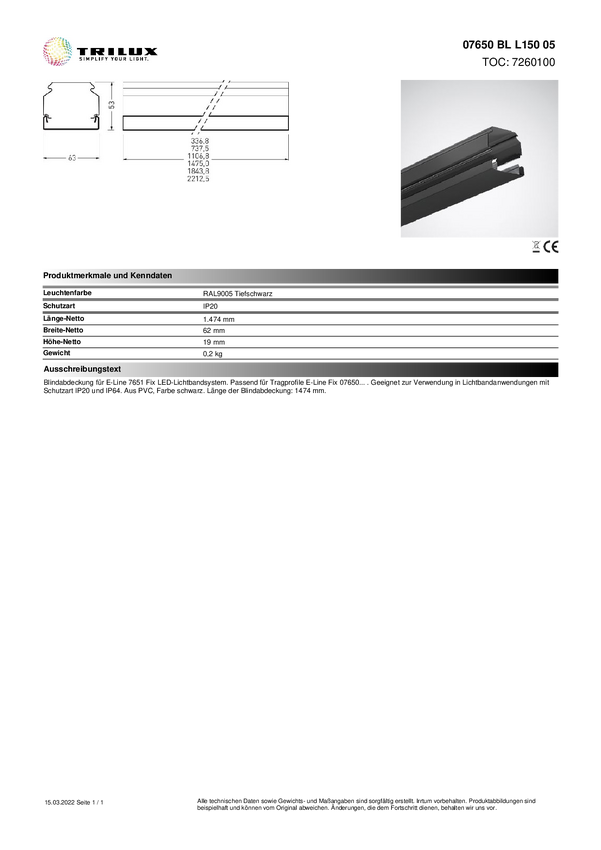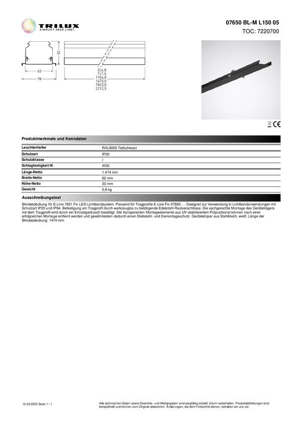 Pokrywa ślepa Trilux 07650 BL-M L150 05 7220700, 1 szt.