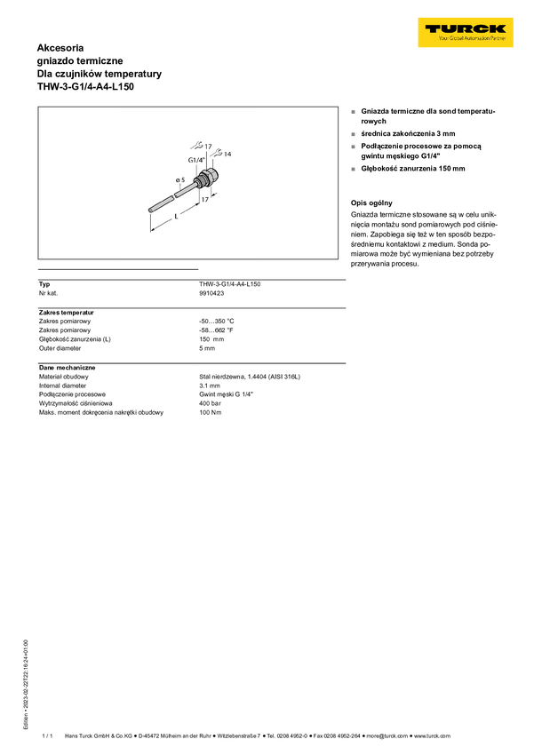 Turck THW-3-G1/4-A4-L150 9910423 1 szt.