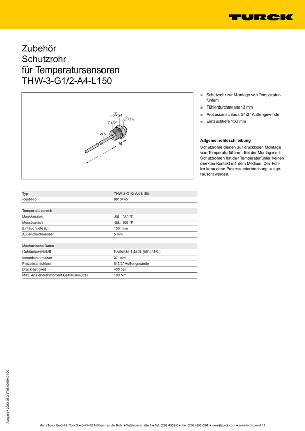 Turck THW-3-G1/8-A4-L150 9910421 1 szt.