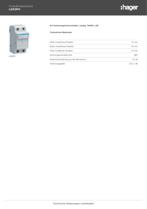 Hager L502PV Wyłącznik bezpiecznikowy 2 styki 1 szt.