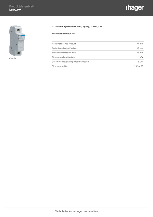Hager L501PV Wyłącznik bezpiecznikowy 1 styk 1 szt.