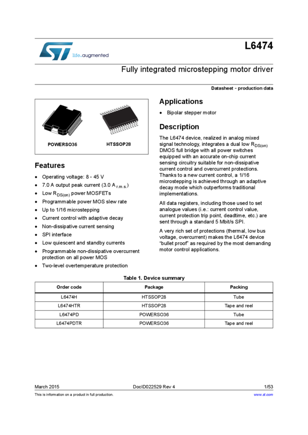 Stepper motor driver mounting the L6474 in high power PowerSO package