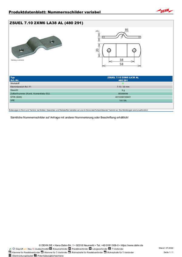 DEHN 480291 ZSUEL 7.10 2XM6 LA38 AL Nakładka z dwoma śrubami 1 szt.