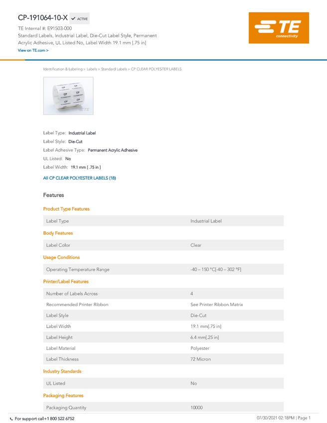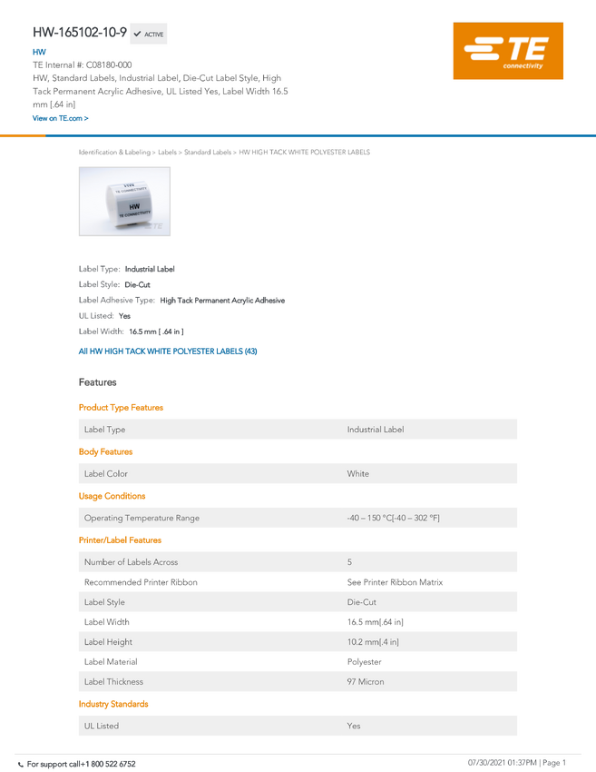 TE Connectivity C08180-000 TE RAY Labels - Standard