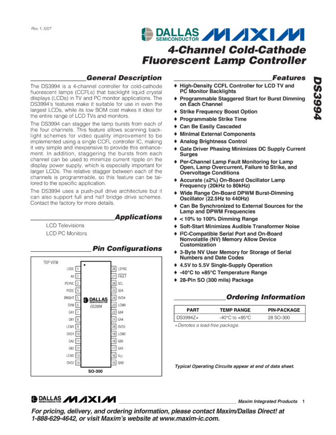 DS3994 4-Channel Cold-Cathode Fluorescent Lamp Controller