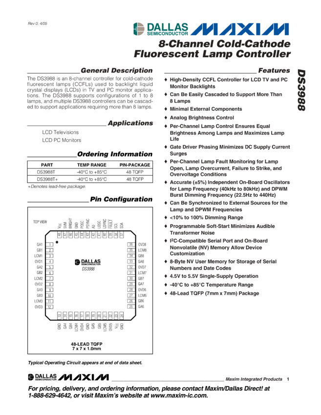 DS3988 8-Channel Cold-Cathode Fluorescent Lamp Controller