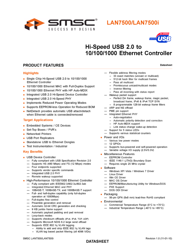 LAN7500 Hi-Speed USB 2.0 to 10/100/1000 Ethernet Controller Data Sheet (11/01/2010)