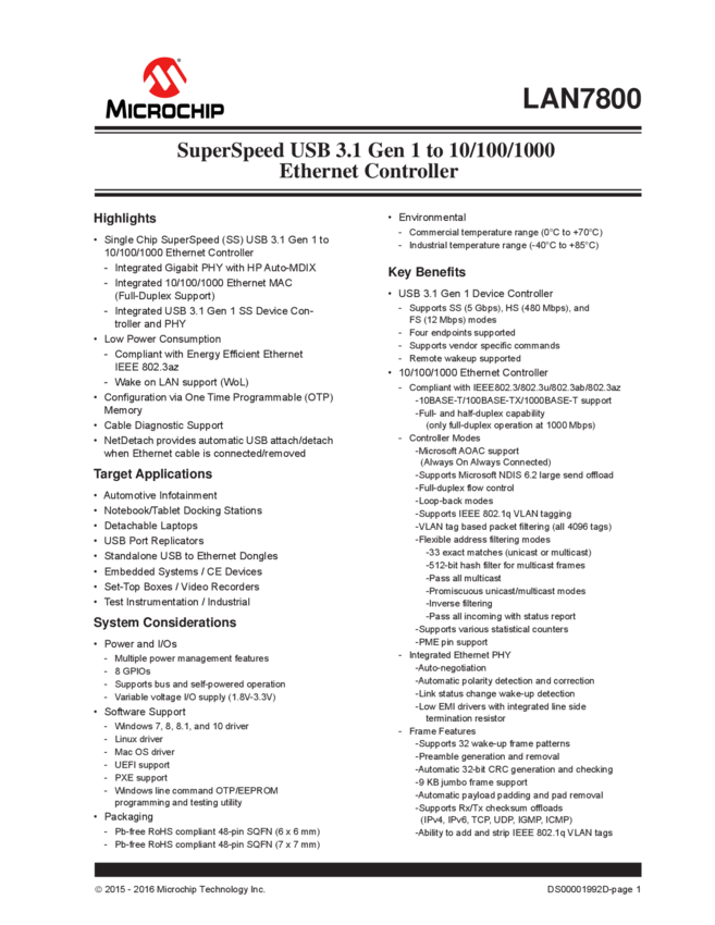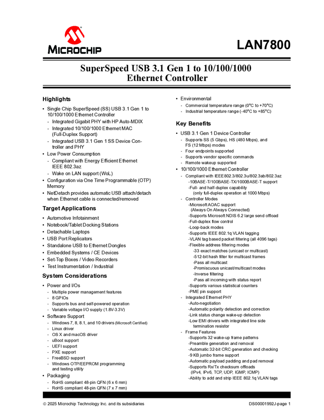 LAN7800 - SuperSpeed USB 3.1 Gen 1 10/100/1000 Ethernet Controller