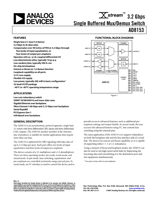 AD8153: Single-Lane 3.2G 2:1 Mux / 1:2 Demux Switch with Input Equalization and Output Pre-Emphasis