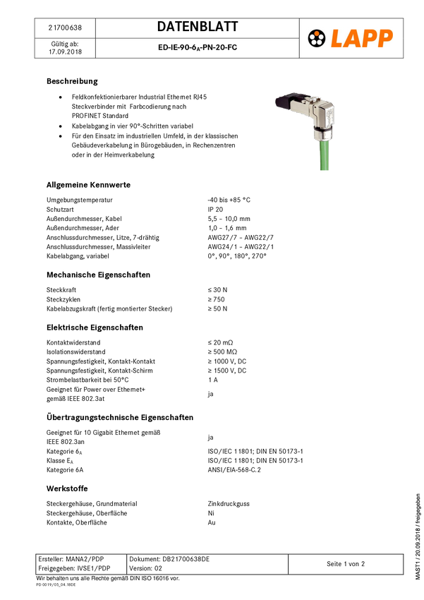 LAPP 21700638 Złącze męskie RJ45 ED-IE-90-6A-PN-20-FC, RJ45 Cat6, CAT 6a, piny:8, 1 szt.