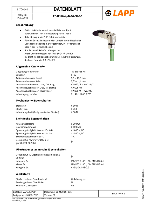 LAPP 21700640 Złącze męskie RJ45 ED-IE-90-6A-B-20-FD-FC, RJ45 Cat6, CAT 6a, piny:8, 1 szt.