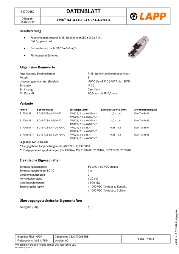 LAPP 21700652 Złącze męskie RJ45 ED-IE-AXS-6A-A-20-FC, RJ45 Cat6, CAT 6a, piny:8, 1 szt.