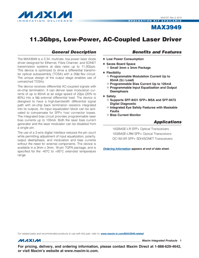 MAX3949 11.3Gbps, Low-Power, AC-Coupled Laser Driver