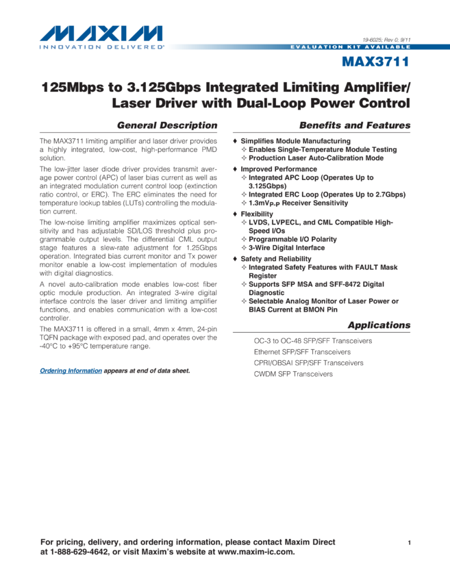 MAX3711 125Mbps to 3.125Gbps Integrated Limiting Amplifier/Laser Driver with Dual-Loop Power Control