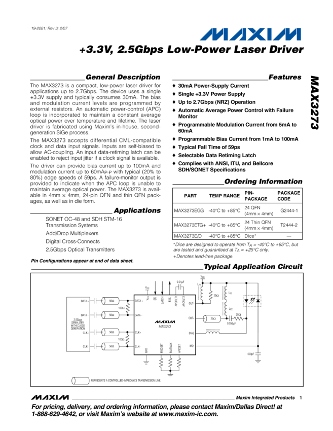 MAX3273 +3.3V, 2.5Gbps Low-Power Laser Driver