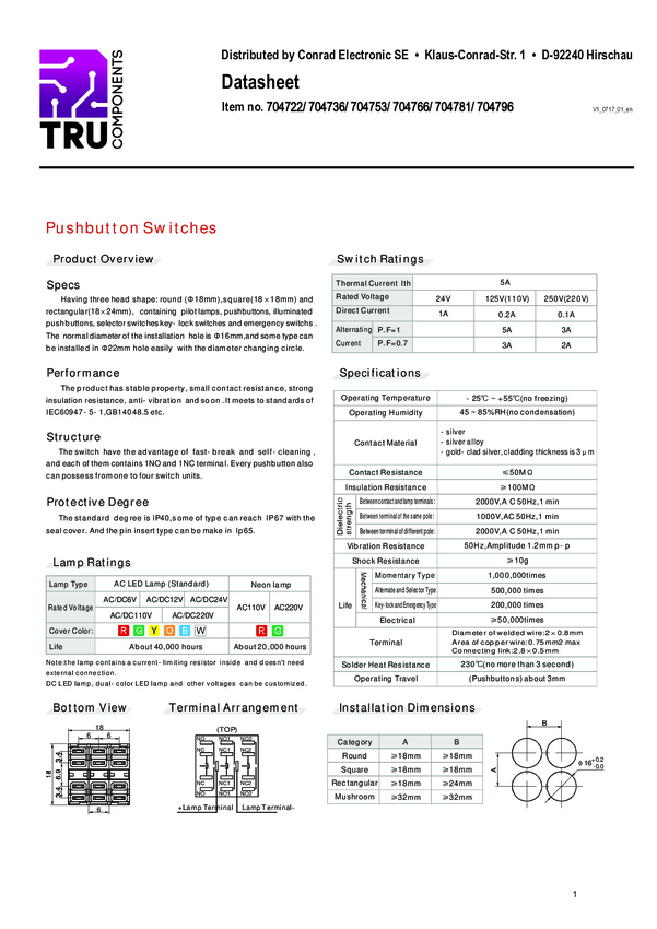 TRU COMPONENTS 704467 Wyłącznik awaryjny LAS1-BGQ-11TS, 250 V/AC, 1 NC, 1 NO, 1 szt.