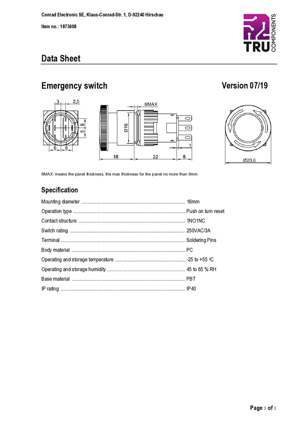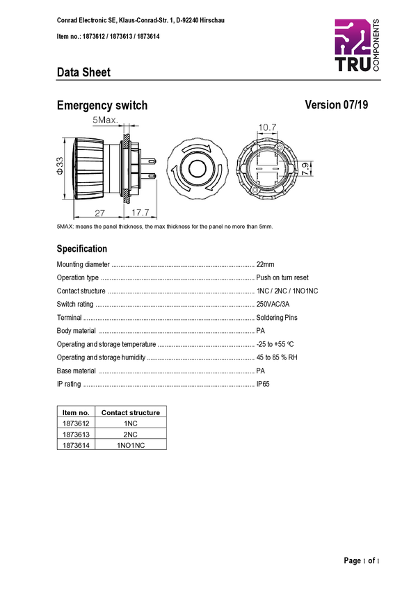TRU COMPONENTS TC-7494448 Wyłącznik awaryjny TC-LAS1-A22Y-01TSB, 250 V/AC, 1 NC, 1 szt.