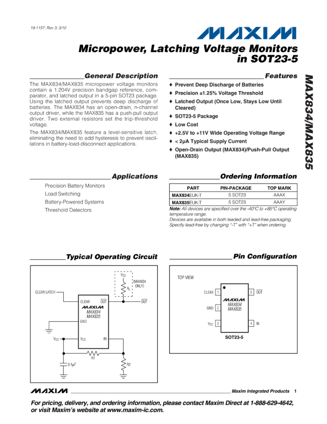 MAX834, MAX835 Micropower, Latching Voltage Monitors in SOT23-5