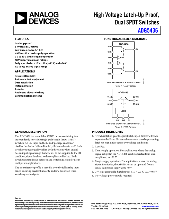 ADG5436: High Voltage Latch-Up Proof, Dual SPDT Switches