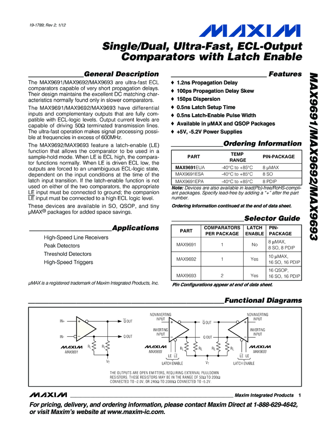 MAX9691, MAX9692, MAX9693 Single/Dual, Ultra-Fast, ECL-Output Comparators with Latch Enable