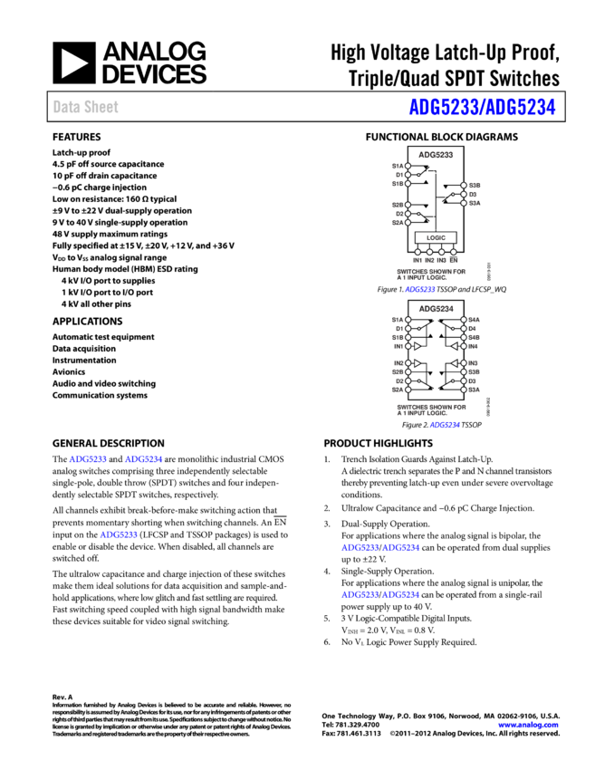 ADG5234: High Voltage Latch-Up Proof, Quad SPDT Switches