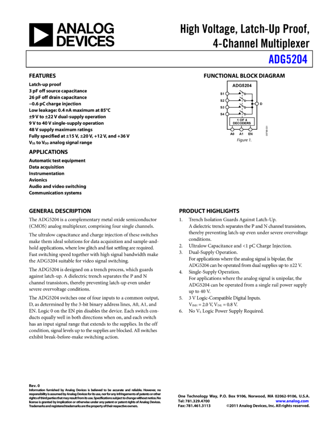 ADG5204: High Voltage, Latch-up Proof, 4-Channel Multiplexer