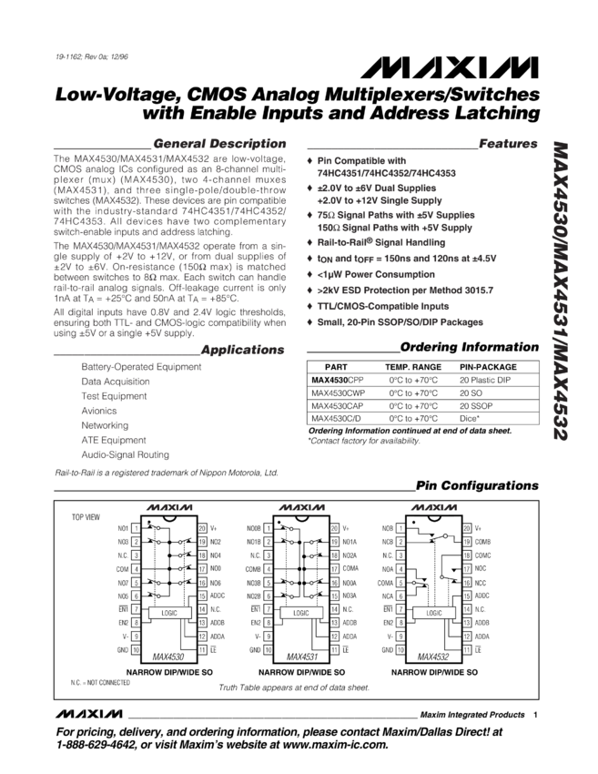 MAX4530, MAX4531, MAX4532 Low-Voltage, CMOS Analog Multiplexers Switches with Enable Inputs and Address Latching