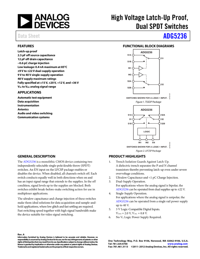 ADG5236: High Voltage Latch-Up Proof, Dual SPDT Switches