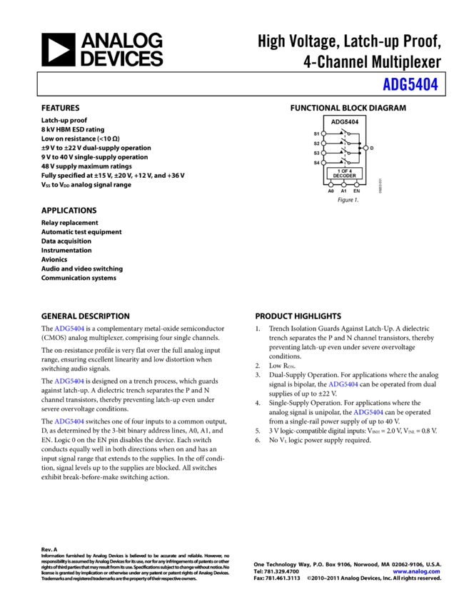 ADG5404: High Voltage Latch-up Proof 4-Channel Multiplexer