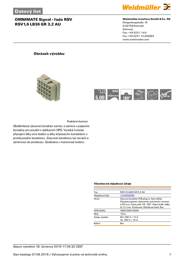 Weidmüller 1446200000 Obudowa złącza pin żeńskiego na PCB RSV1,6 LB36 GR 3,2 AU, wire-to-board, piny: 36, 14 A, 10 szt.
