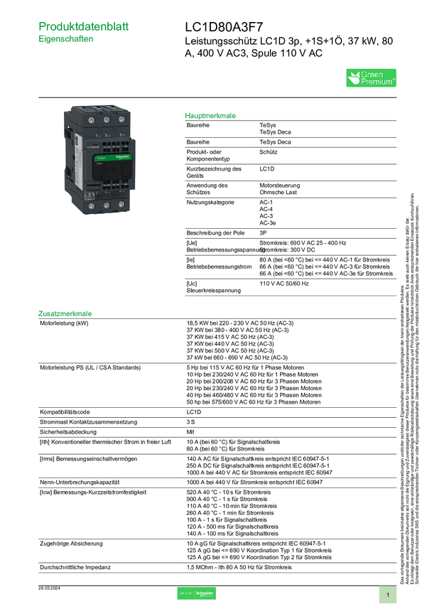 Stycznik Schneider Electric LC1D80A3B7, 1 szt.