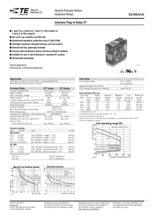 Przekażnik przemysłowy SPDT 16A 24V 1440 R LED wymiary 29 z 13,7 x 26,7 (25,6) mm + piny 4 mm XT374LC4