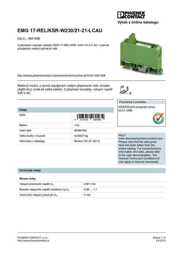 Moduł przekaźnikowy Phoenix Contact EMG 17-REL/KSR-W230/21-21-LCAU 230 V/AC 5 A 2 zestyki przełączne 10 szt.