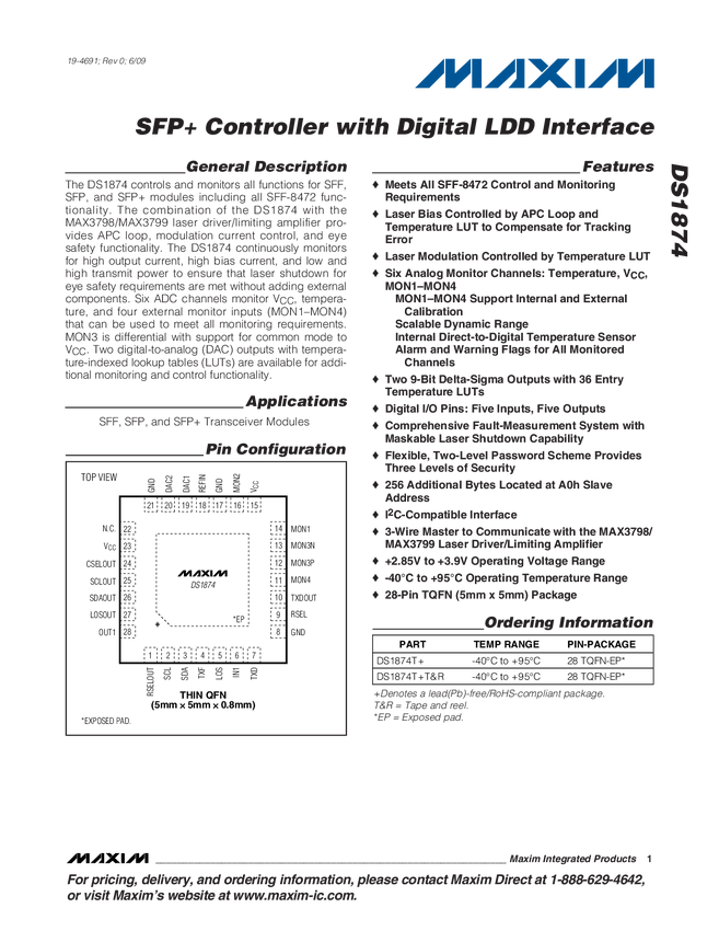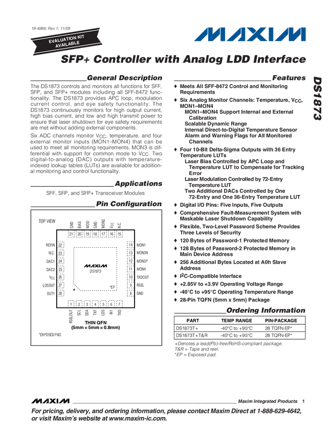 DS1886 SFP and PON ONU Controller with Digital LDD Interface
