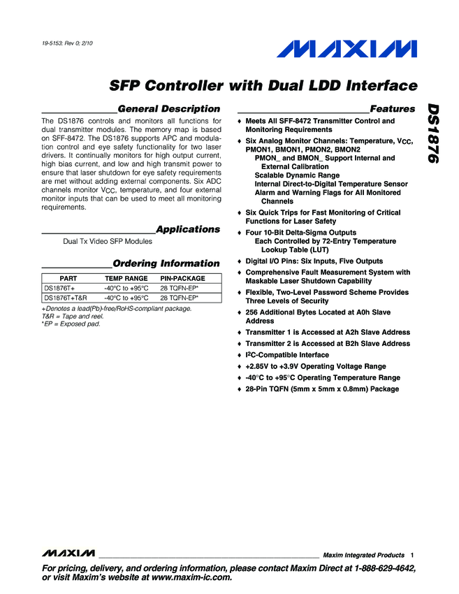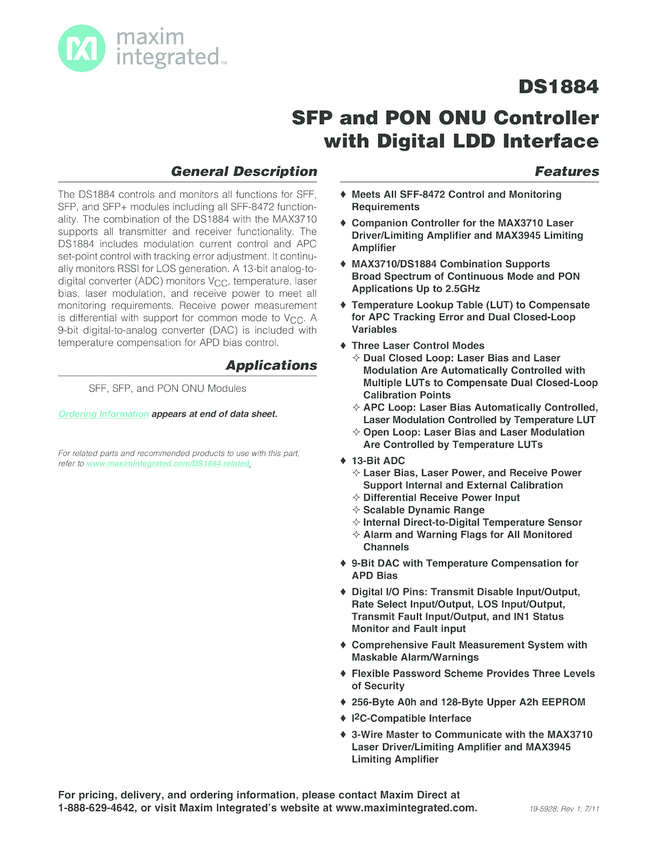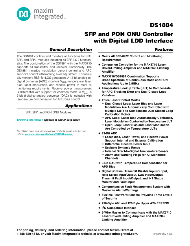 DS1884 SFP and PON ONU Controller with Digital LDD Interface