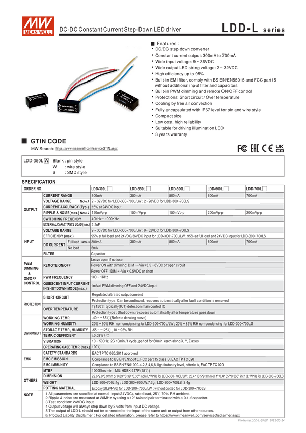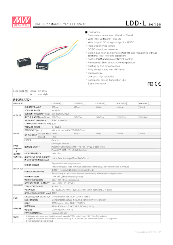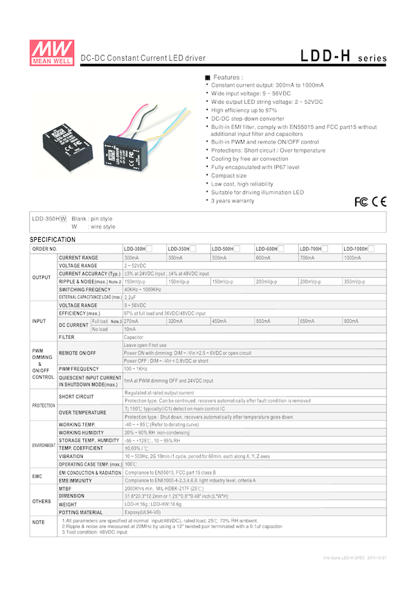 Przetwornica DC/DC MeanWell LDD-350L, Vin 9-36V, Iout 350mA, z kabelkami