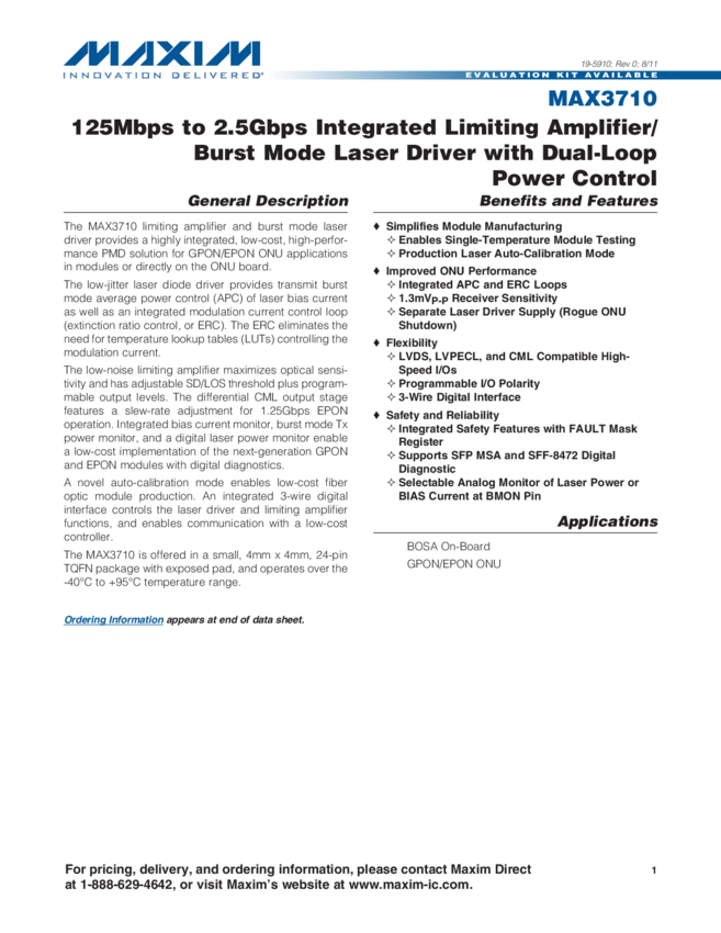 MAX3710 125Mbps to 2.5Gbps, Integrated LA/BM LDD with DPC