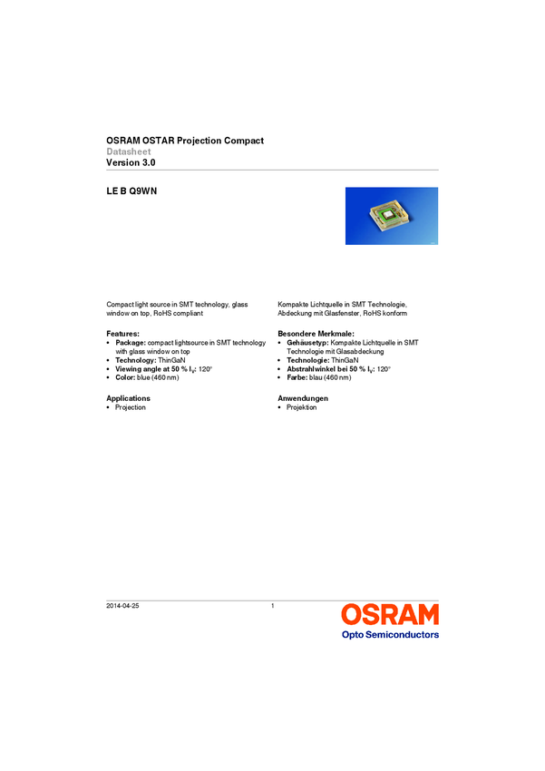 LED Uni-Color Blue 1120mW 455nm Chip LED 3-Pin SMD T/R