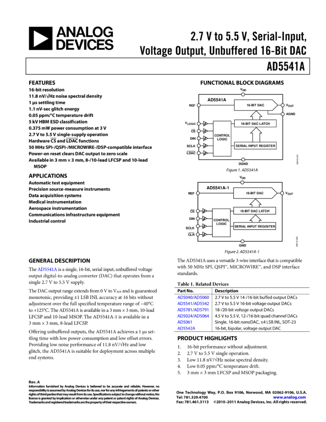 AD5541A: 2.7 V to 5.5 V, Serial-Input, Voltage-Output, 16-/12-Bit DAC™ in 8-lead 3 mm × 3 mm LFCSP