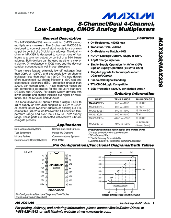 MAX338, MAX339 8-Channel/Dual 4-Channel, Low-Leakage, CMOS Analog Multiplexers