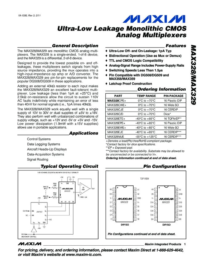 MAX328, MAX329 Ultra-Low-Leakage, Single-Ended, Monolithic, CMOS Analog Multiplexer