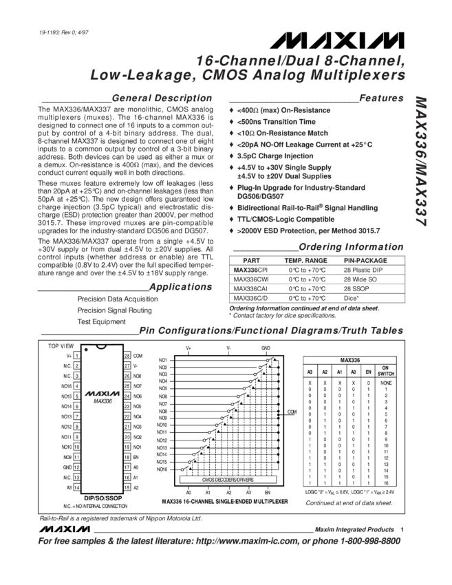 MAX336, MAX337 16-Channel Dual 8 Channel, Low Leakage, CMOS Analog Multiplexers