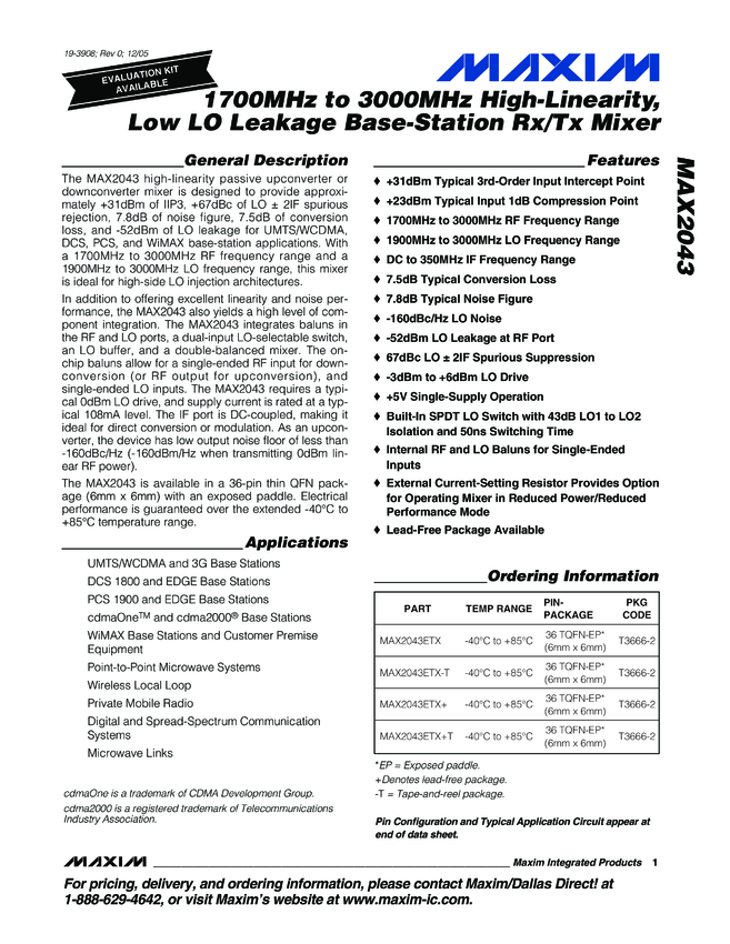MAX2043 1700MHz to 3000MHz High-Linearity, Low LO Leakage Base-Station Rx/Tx Mixer