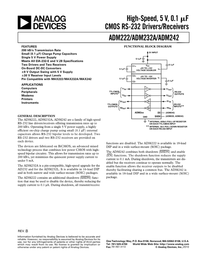 ADM232A: High-Speed, 5 V, 0.1 µF CMOS RS-232 Driver/Receiver Available in 16-lead DIP& in Both Narrow and Wide SOIC Packages