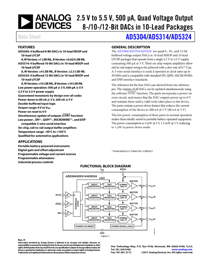 AD5324: 2.5 V to 5.5 V, 500 A Quad Voltage Output 12-Bit DAC in 10-Lead Packages