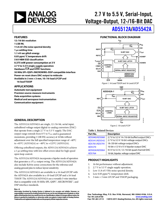 AD5542A: 2.7 V to 5.5 V, Serial-Input, Voltage-Output, 16-/12-Bit DAC™ in 16-lead 3 mm × 3 mm LFCSP & 16-lead TSSOP