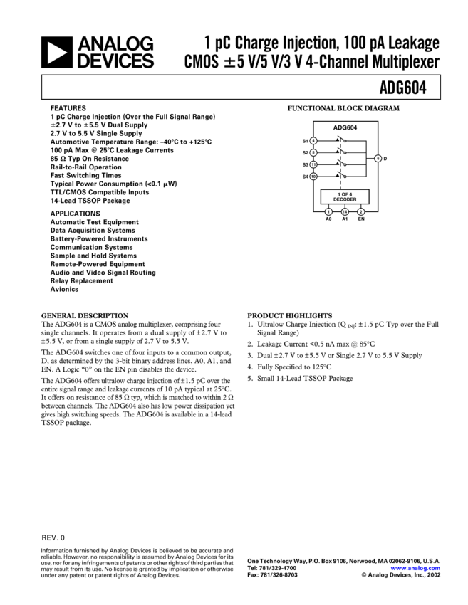 ADG604: 1pC Charge Injection, Low Leakage CMOS 4-Channel Multiplexer